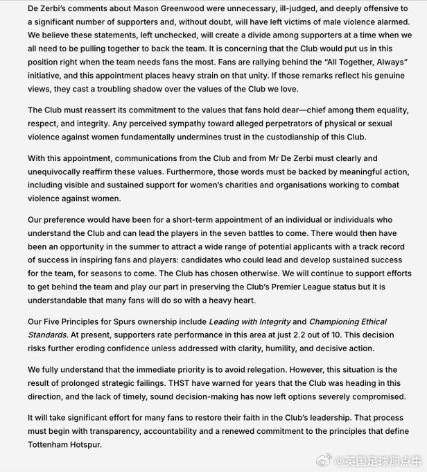 ❌托特纳姆球迷信托(THST)强烈反对德泽尔比就任。原因在于他在前俱乐部对梅森·格林伍德的支持,球迷认为这冒犯了大量支持者,并威胁到俱乐部的核心价值——平等、尊重与诚信。THST指出,俱乐部本可以进行短期任命,选择更合适的人选,但最终选择了德泽尔比,导致球迷信任受损。俱乐部必须通过透明、问...