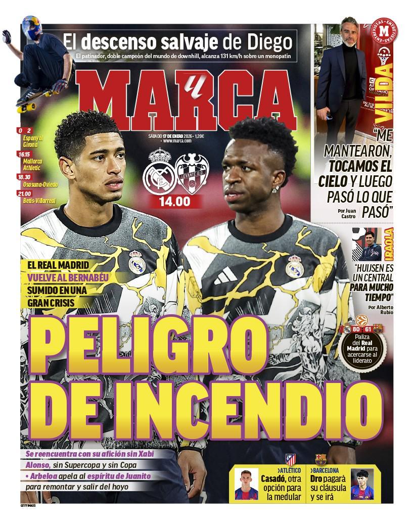 北京时间1月17日21:00,西甲联赛第20轮,在经历了错失西班牙超级杯冠军、西班牙国王杯以及主教练哈维-阿隆索下课后,皇马将重返伯纳乌球场迎战莱万特。早些时候,《马卡报》发布今日头版封面,贝林厄姆、维尼修斯出镜,标题为:伯纳乌球场的“火灾隐患”。